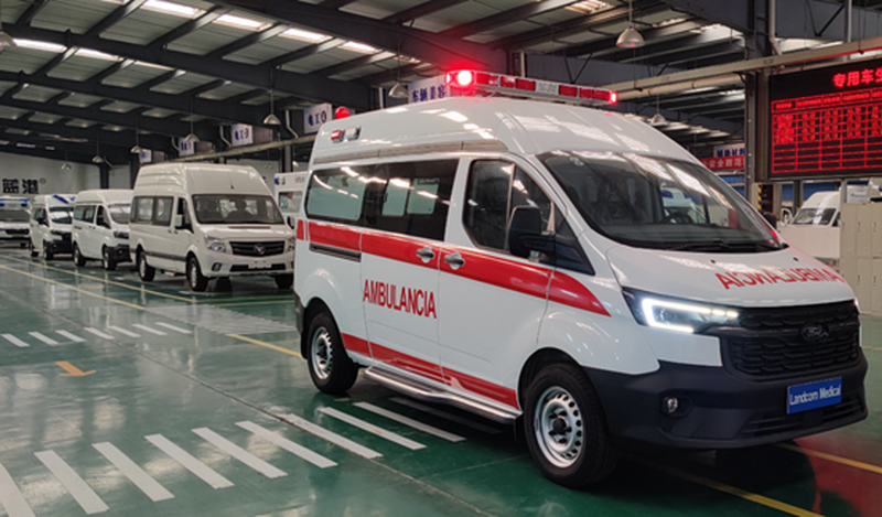The project of customized Landcom brand care-type blister ambulances purchased by Mexican customers, refitted and manufactured on the chassis of the latest Ford gasoline whole vehicles, was successfully delivered and dispatched at the special vehicle factory of Landcom Company today.